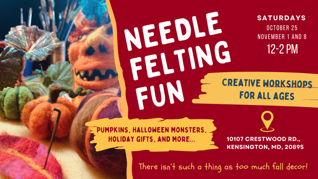 The one-session workshop usually lasts two hours. It includes a brief lecture about the use and purpose of various needles, the quality of wool, and techniques for building the forms and making features. Then, I give a quick demonstration, and the students proceed to their own projects.